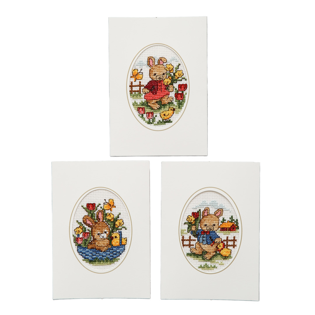 I broderikitet ingår: Mönster 3 kort och kuvert Aidaväv 5,4 rutor/cm DMC-garn i rätt färger och mängd Broderinål Färdigt mått: Ca 6x9 cm