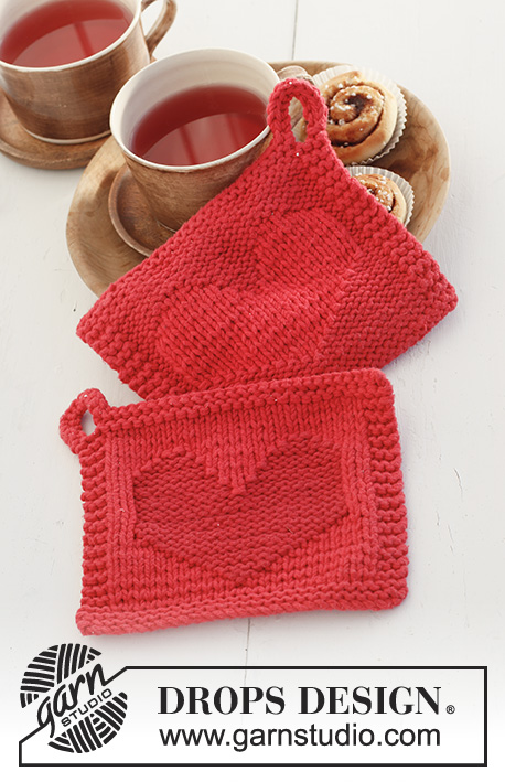 "Heart of the Morning" stickade grytlappar i två trådar Drops Paris DROPS Extra 0-1524