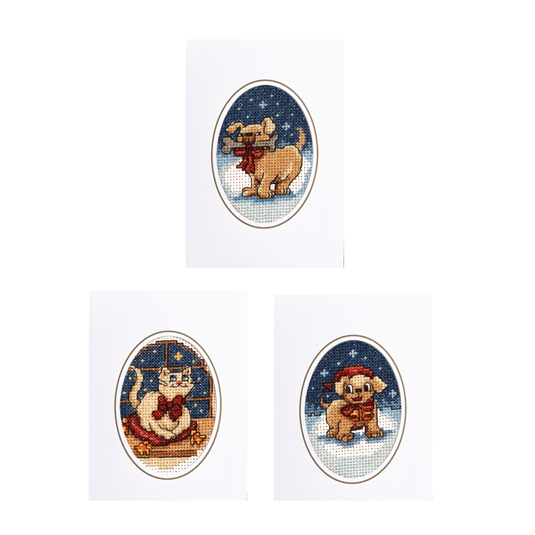 I broderikitet ingår: Mönster 3 kort och kuvert Aidaväv 5,4 rutor/cm DMC-garn i rätt färger och mängd Broderinål Färdigt mått: Ca 6x9 cm