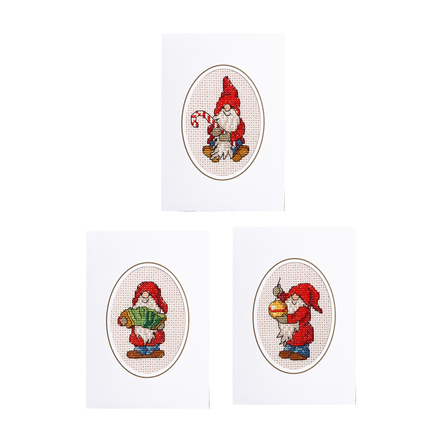 I broderikitet ingår: Mönster 3 kort och kuvert Aidaväv 5,4 rutor/cm DMC-garn i rätt färger och mängd Broderinål Färdigt mått: Ca 6x9 cm
