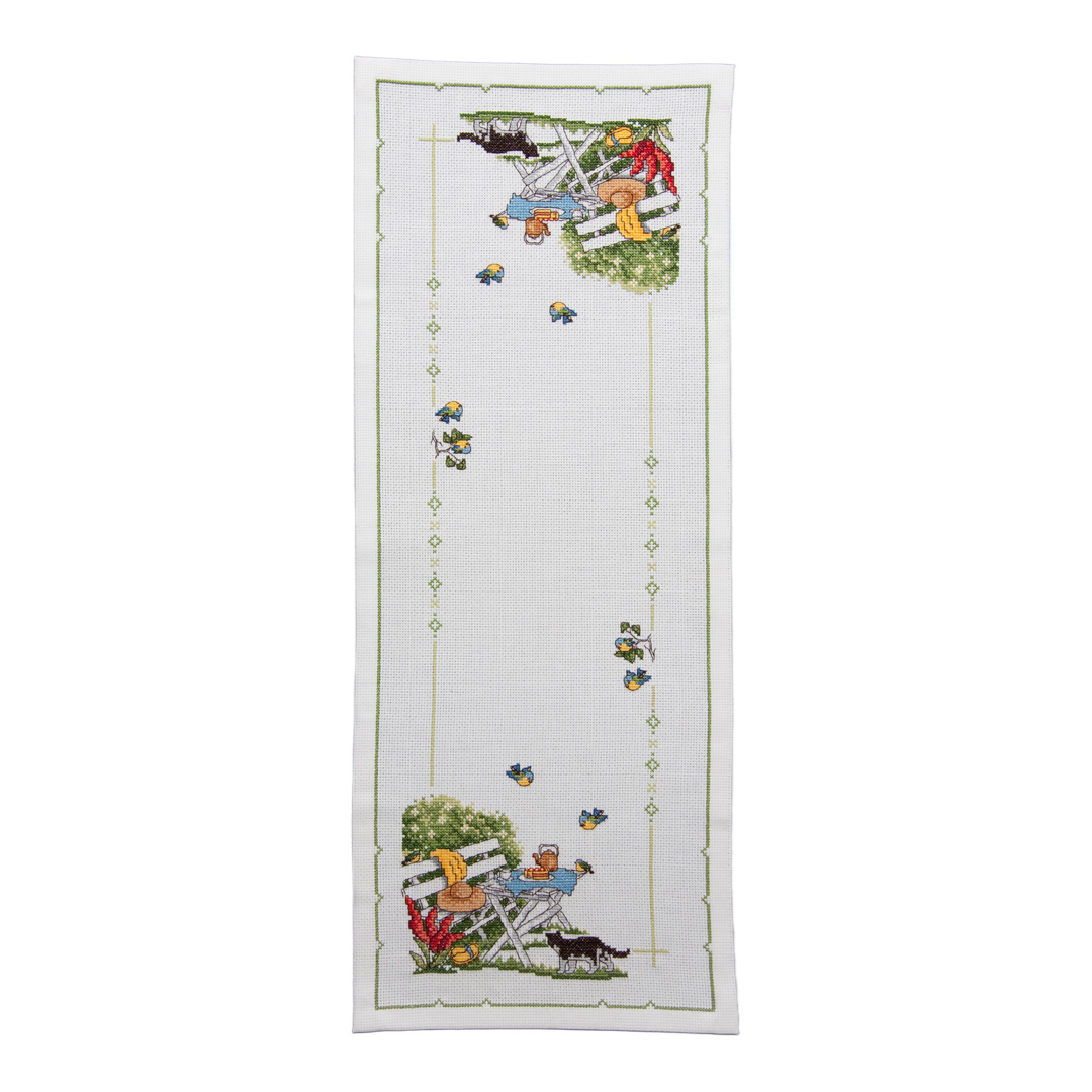 I broderikitet ingår: Mönster Aidaväv 5,4 rutor/cm DMC-garn i rätt färger och mängd Broderinål Färdigt mått: Ca 25x65 cm