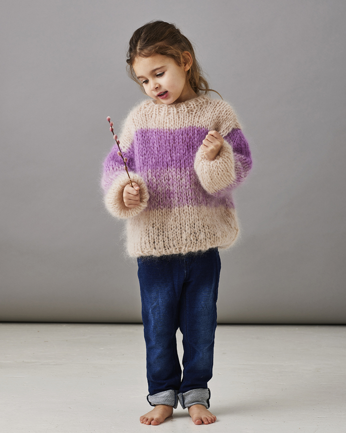 Tröjan stickas i Bella, slätstickning med 2 trådar, nerifrån och upp i fyra delar som därefter sys ihop.