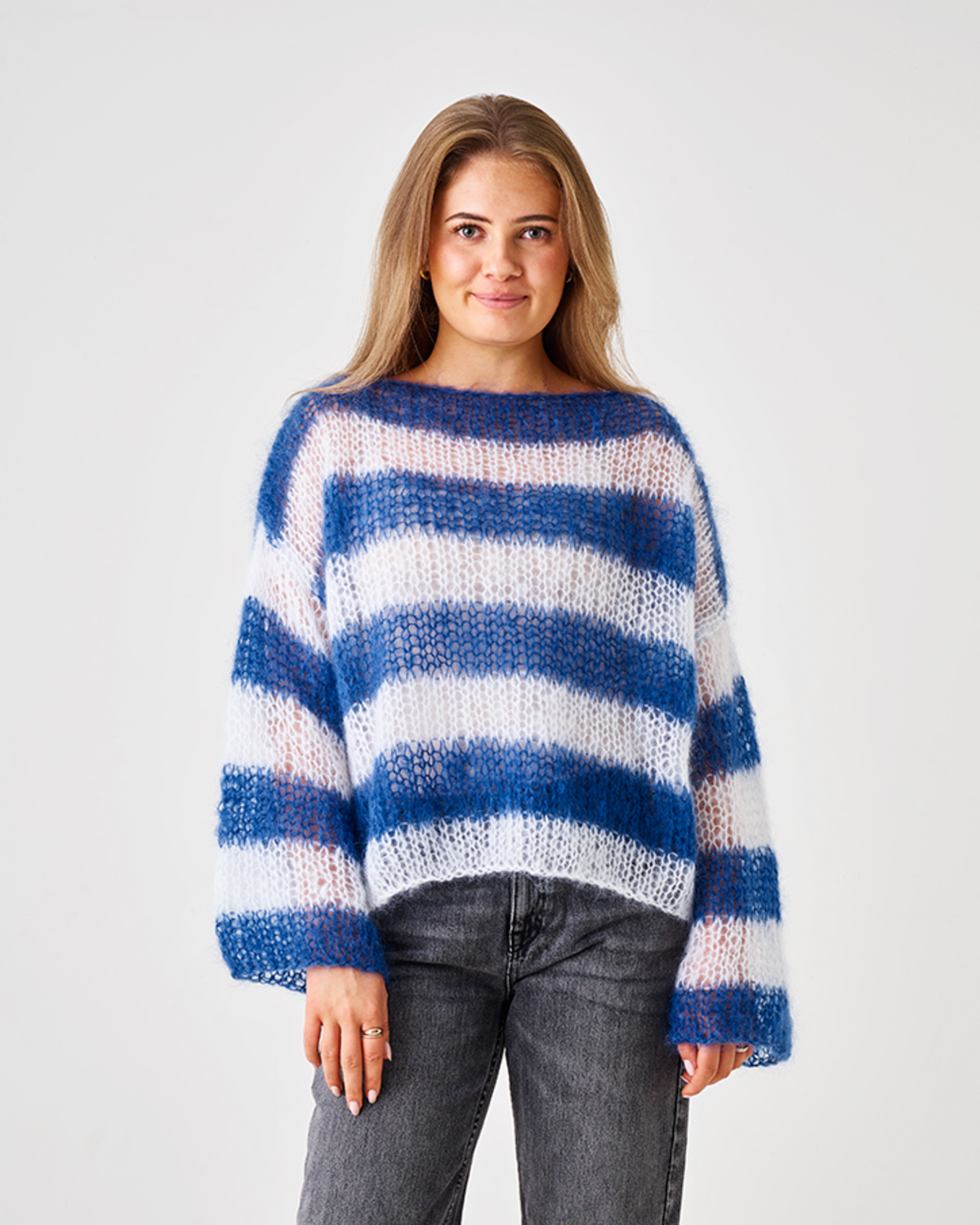 Tröjan stickas i Bella, slätstickning, nerifrån och upp i fyra delar som därefter sys ihop.
